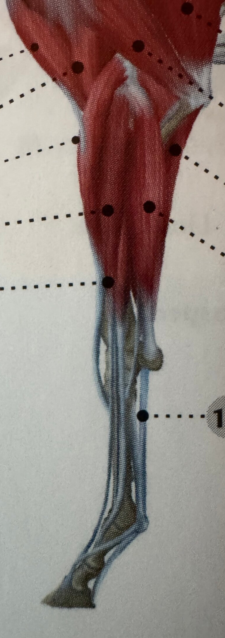 Als we naar de benen van een paard gaan kijken zie je dat deze hoofdzakelijk is opgebouwd uit pezen en ligamenten. In het onderbeen zitten helemaal geen spieren.